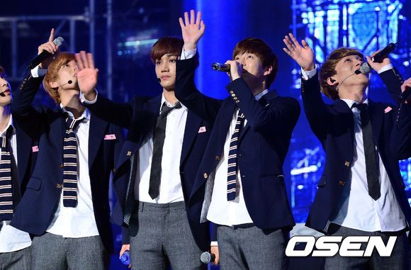 그룹 엑소가 관객들을 향해 인사를 하고 있다.