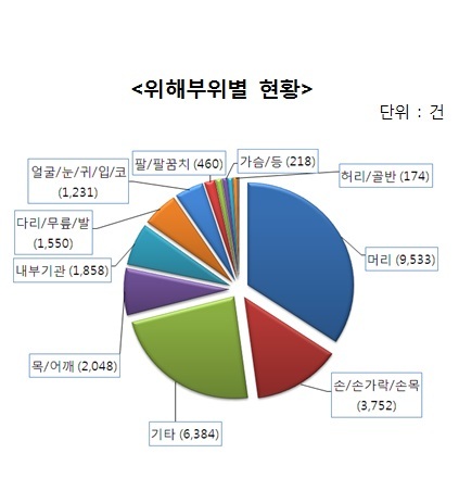 안전사고로 다치는 부위는 ‘머리’가 34.4%(9533건)로 가장 많았고, ‘손·손가락·손목’ 13.5%(3752건), ‘목·어깨’ 7.4%(2048건), ‘신체 내부기관’ 6.7%(1858건) 등의 순으로 확인됐다.