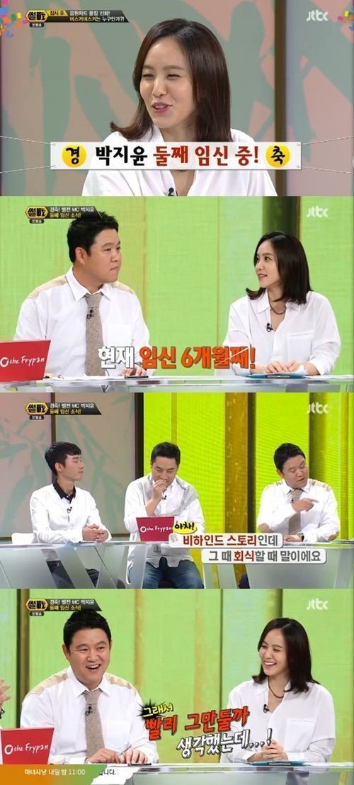 박지윤은 10일 오후 방송된 '썰전'에서 2세 임신 소식을 공개해 멤버들의 축하를 받았다.