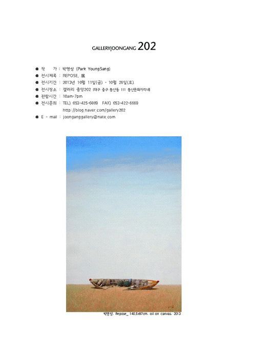 'Repose'라는 이름으로 변주되는 길쭉한 캔버스에는 드넓고 청명한 하늘, 거기에 맞닿으며 낮게 깔린 수평면/지평면, 그리고 이를 배경으로 마치 외딴 섬처럼 덩그러니 떠 있는 낡고 오래된 작은 어선/오두막이 있다. 시간의 흔적을 머금고 있는 남루한 배/집은 사실적으로 세심하게 묘사돼 물성을 그대로 전달한다.