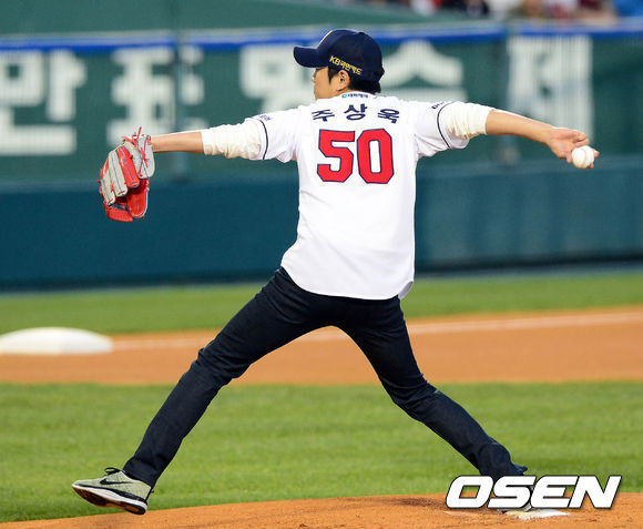 11일 오후 서울 잠실구장에서 열린 '2013 한국야쿠르트 세븐 프로야구' 준플레이오프 3차전 두산 베어스와 넥센 히어로즈의 경기 시작전 주상욱이 시구를 하고 있다.