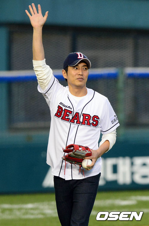 11일 오후 서울 잠실구장에서 열린 '2013 한국야쿠르트 세븐 프로야구' 준플레이오프 3차전 두산 베어스와 넥센 히어로즈의 경기 시작전 주상욱이 시구를 마치고 관중들에게 손을 흔들고 있다.