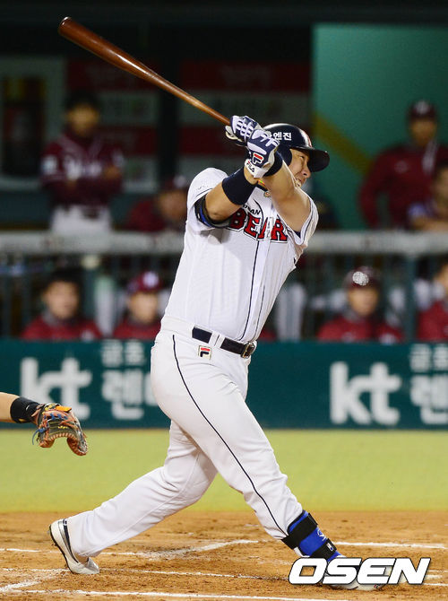 11일 오후 서울 잠실구장에서 열린 '2013 한국야쿠르트 세븐 프로야구' 준플레이오프 3차전 두산 베어스와 넥센 히어로즈의 경기 1회말 1사 3루 김현수가 희생플라이를 치고 있다. 3루주자 이종욱은 홈인.