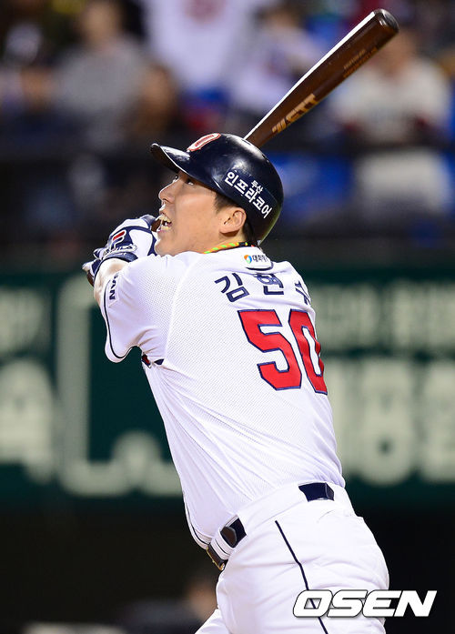 11일 오후 서울 잠실구장에서 열린 '2013 한국야쿠르트 세븐 프로야구' 준플레이오프 3차전 두산 베어스와 넥센 히어로즈의 경기 1회말 1사 3루 두산 김현수가 좌익수 희생플라이로 3루 주자 이종욱을 홈으로 불러들이고 있다.