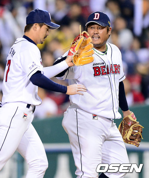 11일 오후 서울 잠실구장에서 열린 '2013 한국야쿠르트 세븐 프로야구' 준플레이오프 3차전 두산 베어스와 넥센 히어로즈의 경기 3회초 2사 두산 최준석이 멋진 수비를 보인 오재원과 기뻐하고 있다.