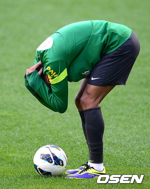네이마르가 프리킥 연습을 하며 볼이 날아오자 머리를 손으로 감싸고 있다.