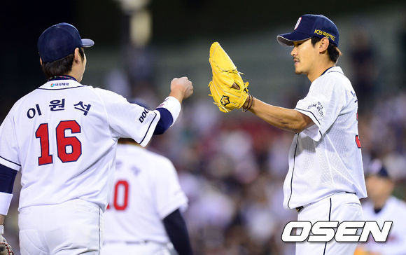 11일 오후 서울 잠실구장에서 열린 '2013 한국야쿠르트 세븐 프로야구' 준플레이오프 3차전 두산 베어스와 넥센 히어로즈의 경기 3회초 무사 1루 두산 노경은이 넥센 문우람과 유한준을 병살로 잡아낸 뒤 기뻐하고 있다.