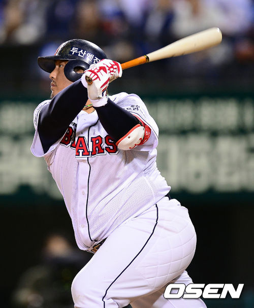 11일 오후 서울 잠실구장에서 열린 '2013 한국야쿠르트 세븐 프로야구' 준플레이오프 3차전 두산 베어스와 넥센 히어로즈의 경기 4회말 2사 최준석이 솔로포를 때리고 있다.
