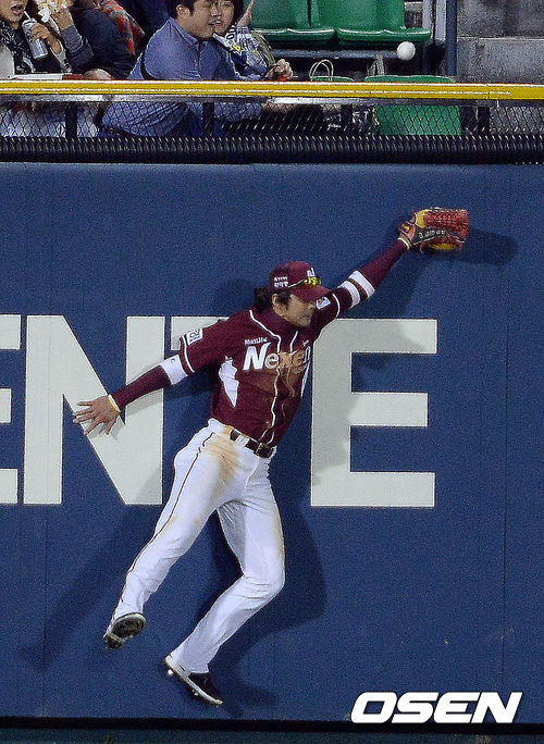11일 오후 서울 잠실야구장에서 열린 '2013 한국야쿠르트 세븐 프로야구' 준플레이오프 3차전 넥센 히어로즈 와 두산 베어스의 경기, 4회말 2사 최준석이 솔로 홈런때 넥센 서동욱 좌익수가 점프하며 수비를 펼쳤으나 홈런을 허용하고 있다.