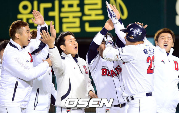 11일 오후 서울 잠실구장에서 열린 '2013 한국야쿠르트 세븐 프로야구' 준플레이오프 3차전 두산 베어스와 넥센 히어로즈의 경기 4회말 2사 두산 홍성흔이 최준석에 이어 백투백 홈런을 때린 뒤 동료들에게 축하받고 있다.