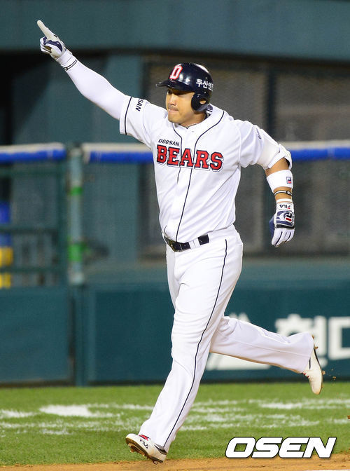 11일 오후 서울 잠실구장에서 열린 '2013 한국야쿠르트 세븐 프로야구' 준플레이오프 3차전 두산 베어스와 넥센 히어로즈의 경기 4회말 2사 홍성흔이 솔로포를 치고 베이스를 돌면서 기뻐하고 있다.