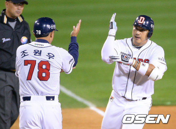 11일 오후 서울 잠실야구장에서 열린 '2013 한국야쿠르트 세븐 프로야구' 준플레이오프 3차전 넥센 히어로즈 와 두산 베어스의 경기, 4회말 2사 홍성흔이 백투백 홈런을 날리고 홈인하며 조원우 코치의 환영을 받고 있다.