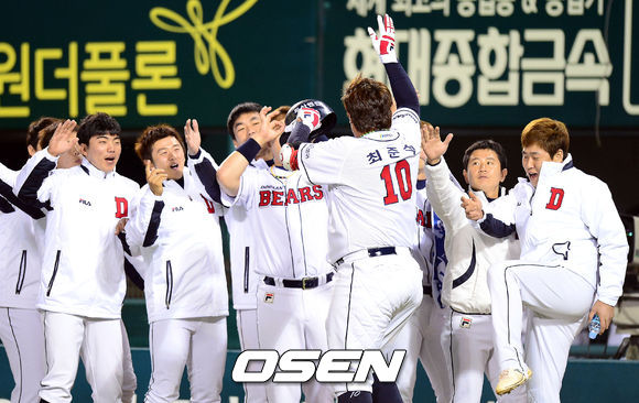 11일 오후 서울 잠실구장에서 열린 '2013 한국야쿠르트 세븐 프로야구' 준플레이오프 3차전 두산 베어스와 넥센 히어로즈의 경기 4회말 2사 두산 최준석이 솔로홈런을 때린 뒤 동료들과 기뻐하고 있다.