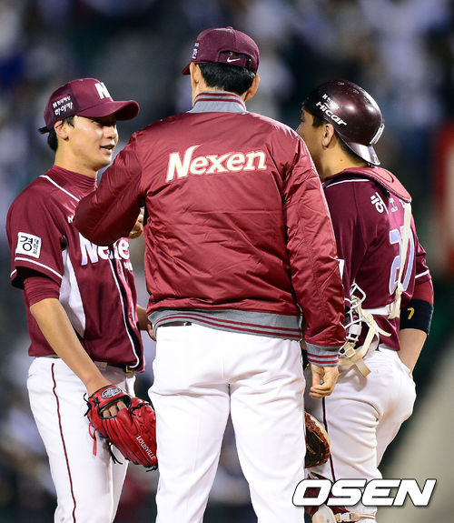 11일 오후 서울 잠실구장에서 열린 '2013 한국야쿠르트 세븐 프로야구' 준플레이오프 3차전 두산 베어스와 넥센 히어로즈의 경기 4회말 2사 넥센 최상덕 코치가 마운드에 올라 오재영과 이야기를 나누고 있다.