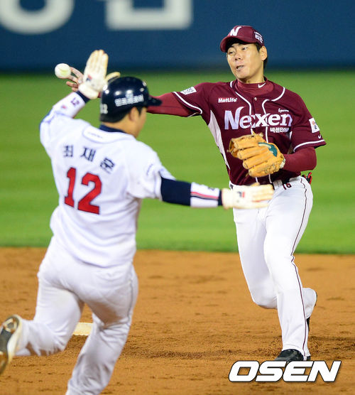 11일 오후 서울 잠실구장에서 열린 '2013 한국야쿠르트 세븐 프로야구' 준플레이오프 3차전 두산 베어스와 넥센 히어로즈의 경기 5회말 1사 1루 이종욱의 병살타를 강정호가 2루에서 최재훈을 포스아웃시킨 후 1루로 송구하고 있다.