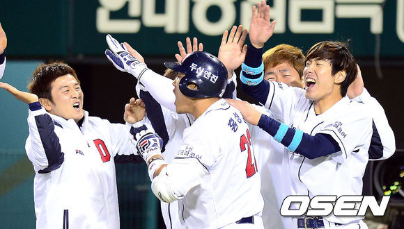 11일 오후 서울 잠실구장에서 열린 '2013 한국야쿠르트 세븐 프로야구' 준플레이오프 3차전 두산 베어스와 넥센 히어로즈의 경기 4회말 2사 두산 홍성흔이 최준석에 이어 백투백 홈런을 때린 뒤 동료들에게 축하받고 있다.
