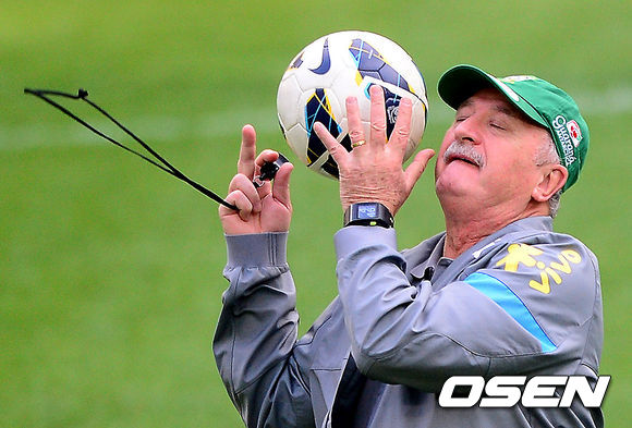 스콜라리 감독이 훈련 도중 날아 든 볼을 잡아내고 있다.