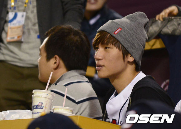 11일 오후 서울 잠실야구장에서 열린 '2013 한국야쿠르트 세븐 프로야구' 준플레이오프 3차전 넥센 히어로즈 와 두산 베어스의 경기, 가수 케이윌이 경기를 관전하고 있다.