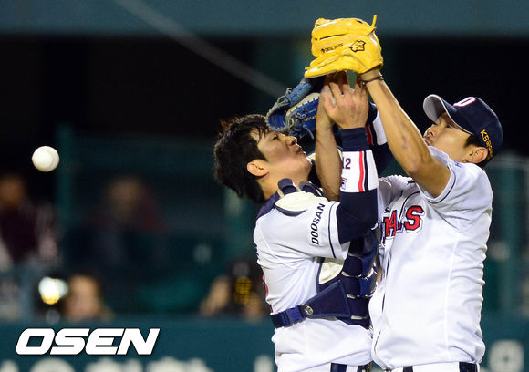 11일 오후 서울 잠실구장에서 열린 '2013 한국야쿠르트 세븐 프로야구' 준플레이오프 3차전 두산 베어스와 넥센 히어로즈의 경기 6회초 서건창의 뜬공을 최재훈과 노경은이 놓치고 있다.