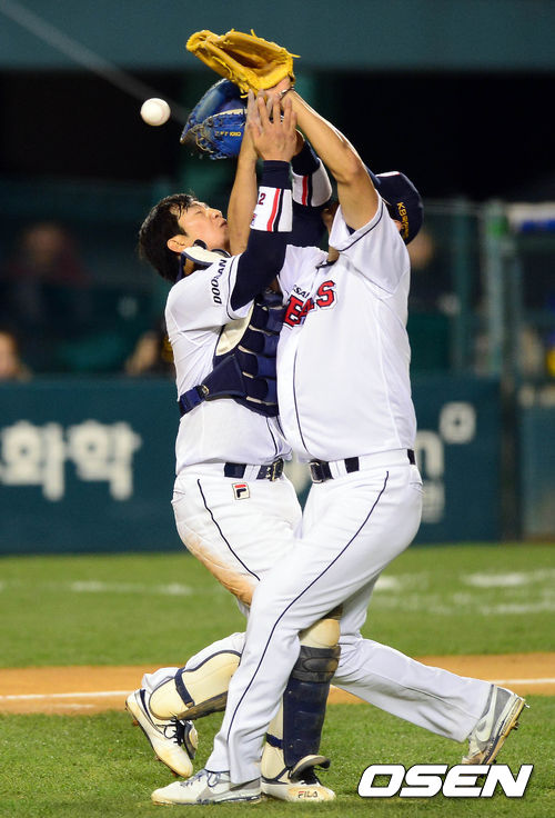 11일 오후 서울 잠실구장에서 열린 '2013 한국야쿠르트 세븐 프로야구' 준플레이오프 3차전 두산 베어스와 넥센 히어로즈의 경기 6회초 2사 서건창의 뜬공을 노경은과 최재훈이 놓치고 있다.