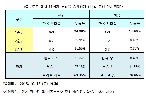 이번 축구토토 매치 11회차는 12일 오후 7시 50분에 발매가 마감된다.