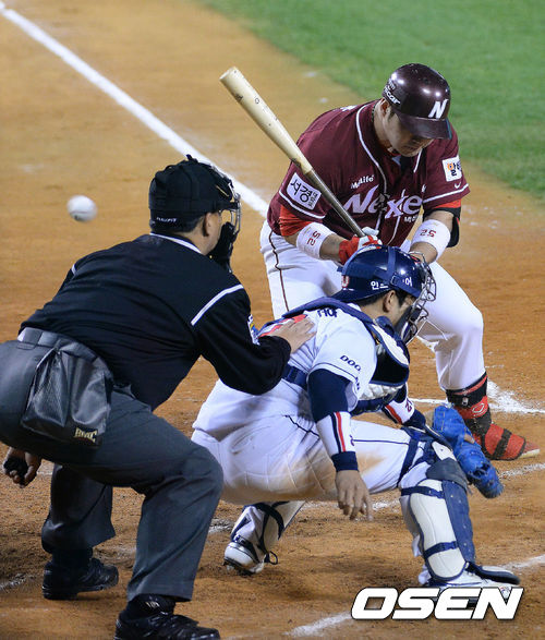 11일 오후 서울 잠실야구장에서 열린 '2013 한국야쿠르트 세븐 프로야구' 준플레이오프 3차전 넥센 히어로즈 와 두산 베어스의 경기, 7회초 무사 1루 박병호 타석때 두산 노경은의 와일드피칭으로 낫아웃 진루하고 있다.