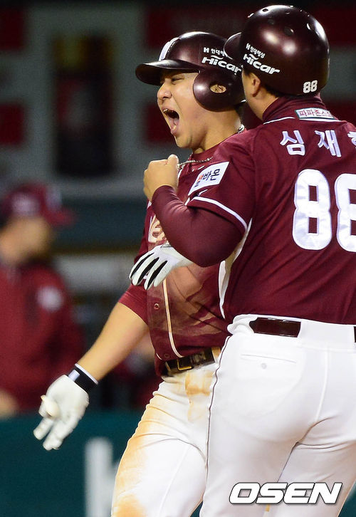 11일 오후 서울 잠실구장에서 열린 '2013 한국야쿠르트 세븐 프로야구' 준플레이오프 3차전 두산 베어스와 넥센 히어로즈의 경기 7회초 무사 1,2루 김민성이 스리런포를 치고 홈에서 환호하고 있다.