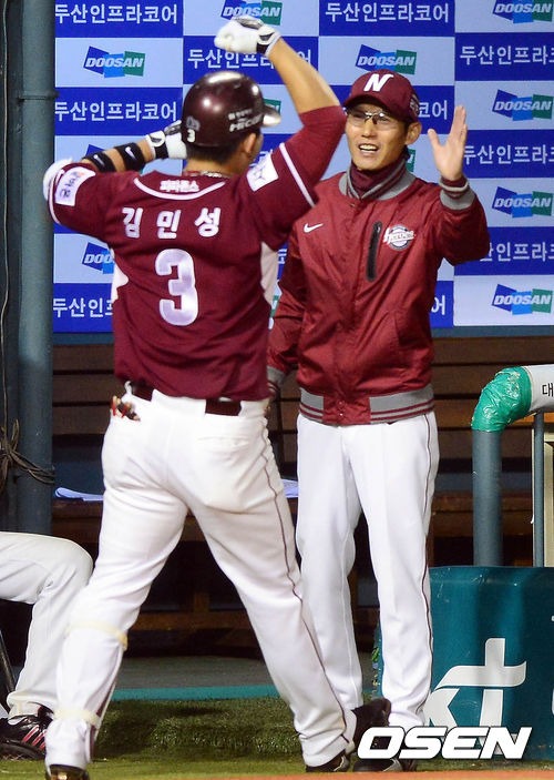 11일 오후 서울 잠실구장에서 열린 '2013 한국야쿠르트 세븐 프로야구' 준플레이오프 3차전 두산 베어스와 넥센 히어로즈의 경기 7회초 무사 1,2루 김민성이 스리런포를 치고 덕아웃에서 염경엽 감독과 하이파이브를 하고 있다.
