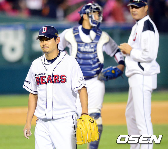 11일 오후 서울 잠실구장에서 열린 '2013 한국야쿠르트 세븐 프로야구' 준플레이오프 3차전 두산 베어스와 넥센 히어로즈의 경기 7회초 무사 1,2루 김민성에게 스리런포를 허용한 노경은이 마운드를 내려가고 있다.