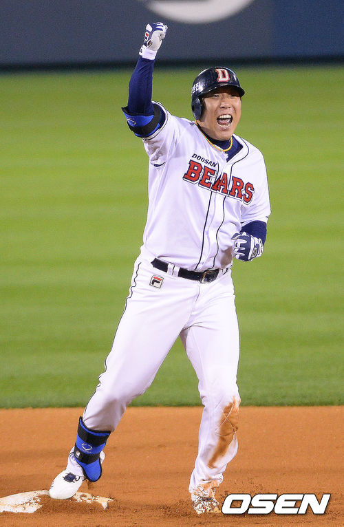 11일 오후 서울 잠실야구장에서 열린 '2013 한국야쿠르트 세븐 프로야구' 준플레이오프 3차전 넥센 히어로즈 와 두산 베어스의 경기, 9회말 선두타자 김현수 우익수 키를 넘기는 안타를 치고 2루에서 환호하고 있다.