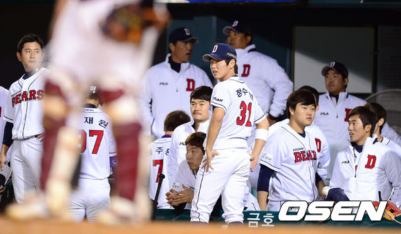 11일 오후 서울 잠실구장에서 열린 '2013 한국야쿠르트 세븐 프로야구' 준플레이오프 3차전 두산 베어스와 넥센 히어로즈의 경기 9회말 1사 3루 두산 선수들이 홍성흔의 중견수 플라이때 득점을 올리지 못하자 아쉬워하고 있다.
