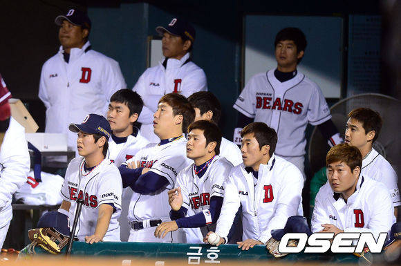 11일 오후 서울 잠실구장에서 열린 '2013 한국야쿠르트 세븐 프로야구' 준플레이오프 3차전 두산 베어스와 넥센 히어로즈의 경기 9회말 2사 3루 두산 이원석이 2루수 땅볼로 아웃되자 두산 선수들이 아쉬워하고 있다.