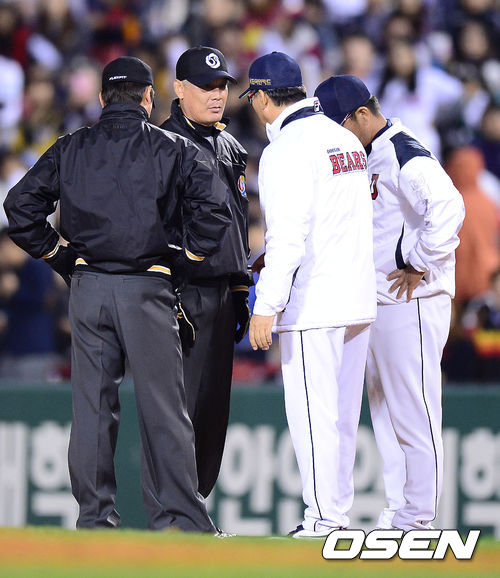 11일 오후 서울 잠실구장에서 열린 '2013 한국야쿠르트 세븐 프로야구' 준플레이오프 3차전 두산 베어스와 넥센 히어로즈의 경기 연장 11회초 무사 1루에서 윤명준의 견제구가 불펜으로 빠지며 투베이스 판정이 내려지자 김진욱 감독이 항의하고 있다.