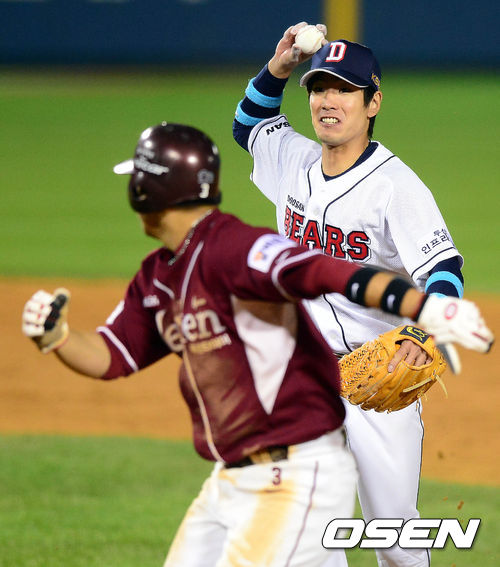 11일 오후 서울 잠실구장에서 열린 '2013 한국야쿠르트 세븐 프로야구' 준플레이오프 3차전 두산 베어스와 넥센 히어로즈의 경기 12회초 1사 1루 강정호의 땅볼 상황, 김재호가 런다운에 걸린 1루주자 김민성을 쫓아가고 있다.