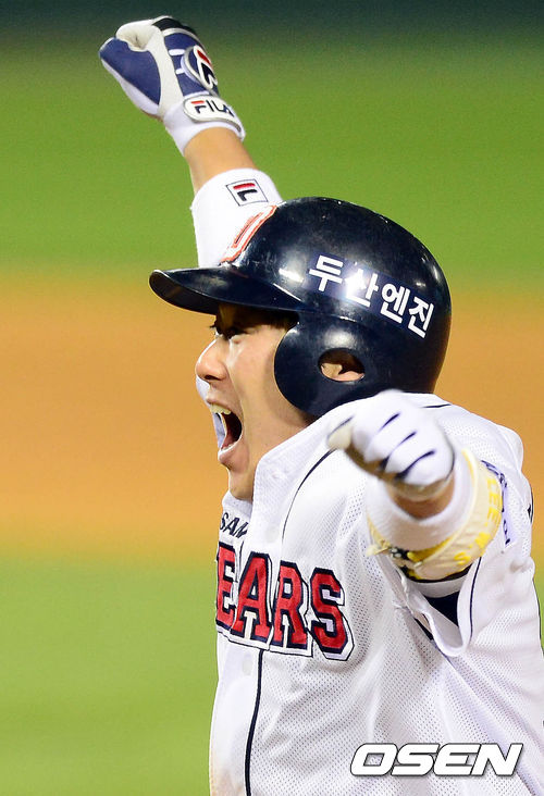 11일 오후 서울 잠실구장에서 열린 '2013 한국야쿠르트 세븐 프로야구' 준플레이오프 3차전 두산 베어스와 넥센 히어로즈의 경기 14회말 무사 1,3루 이원석이 끝내기 안타를 치고 덕아웃을 바라보며 환호하고 있다.