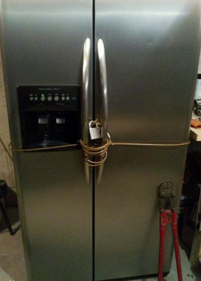 최근 한 해외 온라인 커뮤니티에는 '강철 같은 다이어트 결심'이라는 제목의 사진이 한 장 올라와 관심을 모았다. 공개된 게시판의 사진에는 다이어트를 결심한 듯 양문형 냉장고 손잡이를 굵은 쇠줄로 감아 놓은 모습이 찍혀 있다.