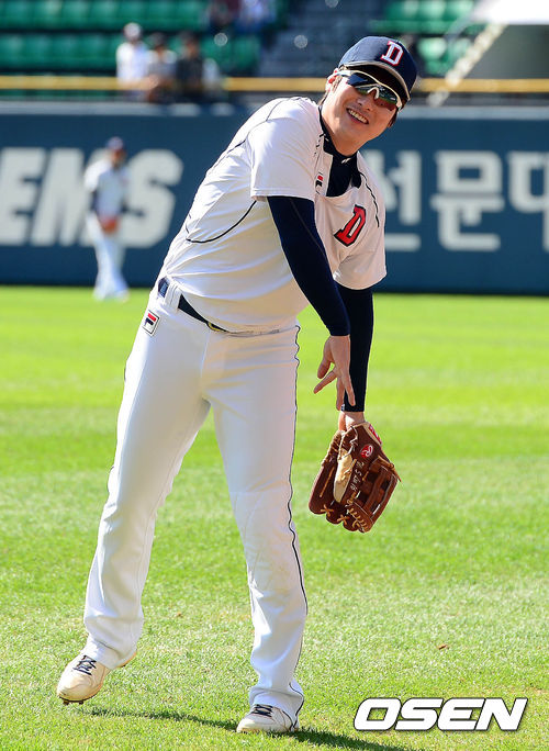 12일 오후 서울 잠실구장에서 열리는 '2013 한국야쿠르트 세븐 프로야구' 준플레이오프 4차전 두산 베어스와 넥센 히어로즈의 경기 시작전 이원석이 훈련을 하면서 미소를 짓고 있다.