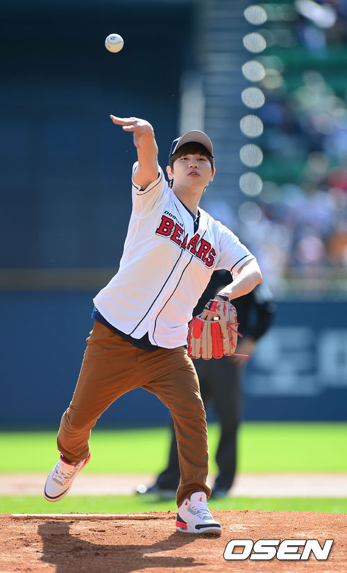 12일 오후 서울 잠실구장에서 열리는 '2013 한국야쿠르트 세븐 프로야구' 준플레이오프 4차전 두산 베어스와 넥센 히어로즈의 경기전 가수 케이윌이 시구를 하고 있다.