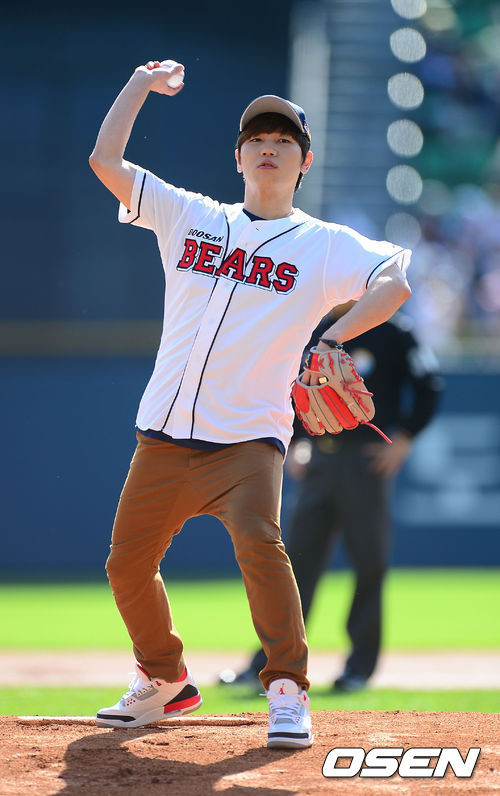 12일 오후 서울 잠실구장에서 열리는 '2013 한국야쿠르트 세븐 프로야구' 준플레이오프 4차전 두산 베어스와 넥센 히어로즈의 경기전 가수 케이윌이 시구를 하고 있다.