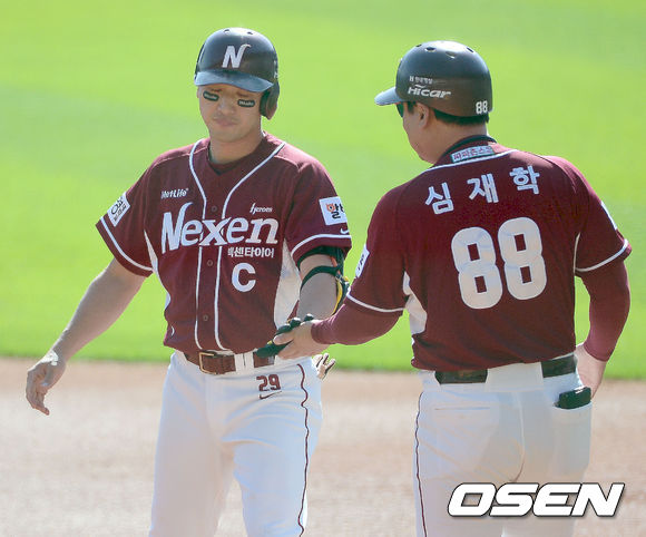 12일 오후 서울 잠실야구장에서 열린 '2013 한국야쿠르트 세븐 프로야구' 준플레이오프 4차전 두산 베어스 와 넥센 히어로즈의 경기, 1회초 1사 3루 이택근 중견수 앞에 떨어지는 1타점 적시타를 날리고 심재학 코치의 환영을 받고 있다.