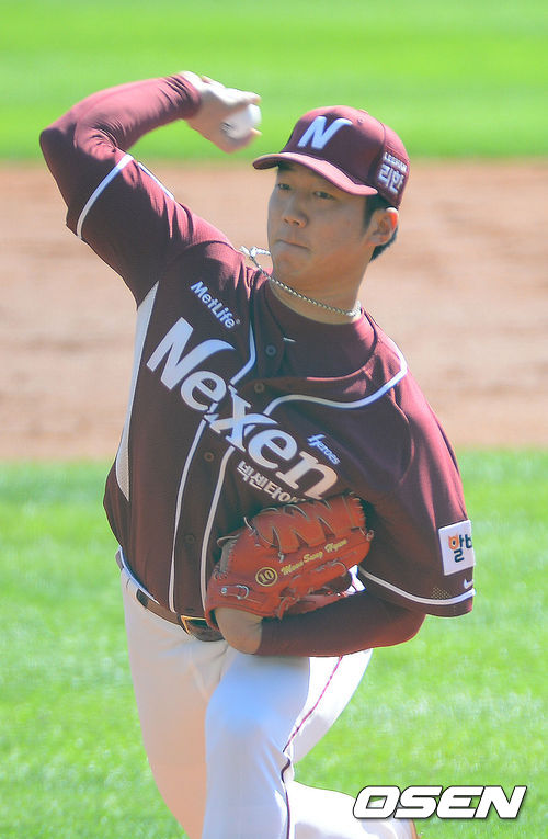 12일 오후 서울 잠실야구장에서 열린 '2013 한국야쿠르트 세븐 프로야구' 준플레이오프 4차전 두산 베어스 와 넥센 히어로즈의 경기, 넥센 선발 문성현이 공을 뿌리고 있다.