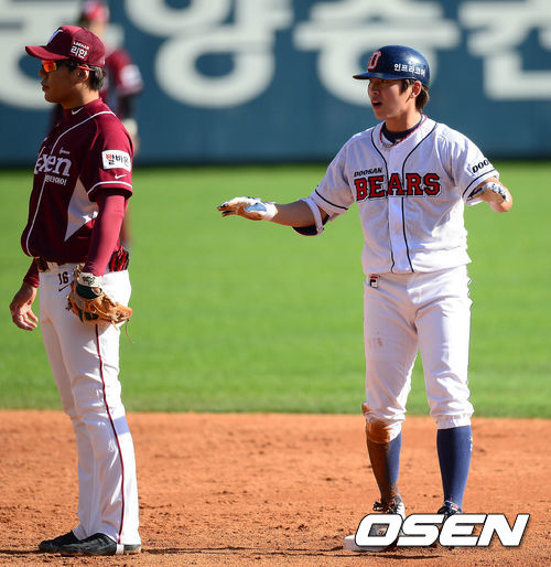 12일 오후 서울 잠실구장에서 열린 '2013 한국야쿠르트 세븐 프로야구' 준플레이오프 4차전 두산 베어스와 넥센 히어로즈의 경기 3회말 선두타자 정수빈이 스트라이크 낫아웃 폭투에 2루까지 진루 했지만, 1루로 돌아가라는 주심의 판정을 받고 있다.