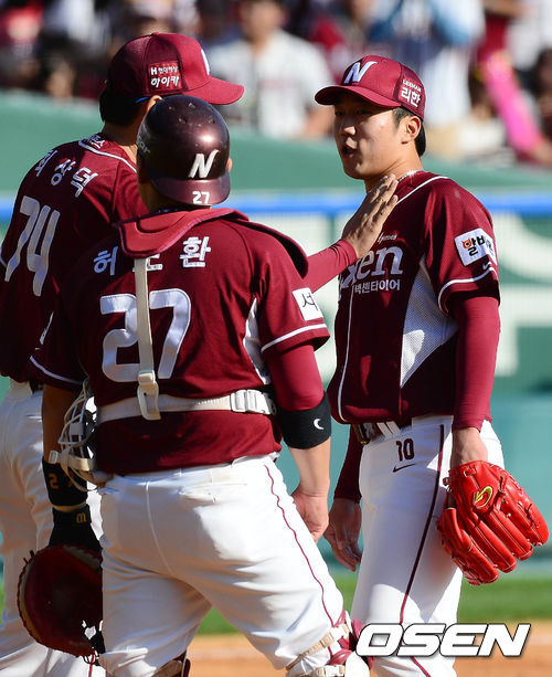 12일 오후 서울 잠실구장에서 열린 '2013 한국야쿠르트 세븐 프로야구' 준플레이오프 4차전 두산 베어스와 넥센 히어로즈의 경기 3회말 무사 1루 문성현이 마운드를 내려가고 있다.