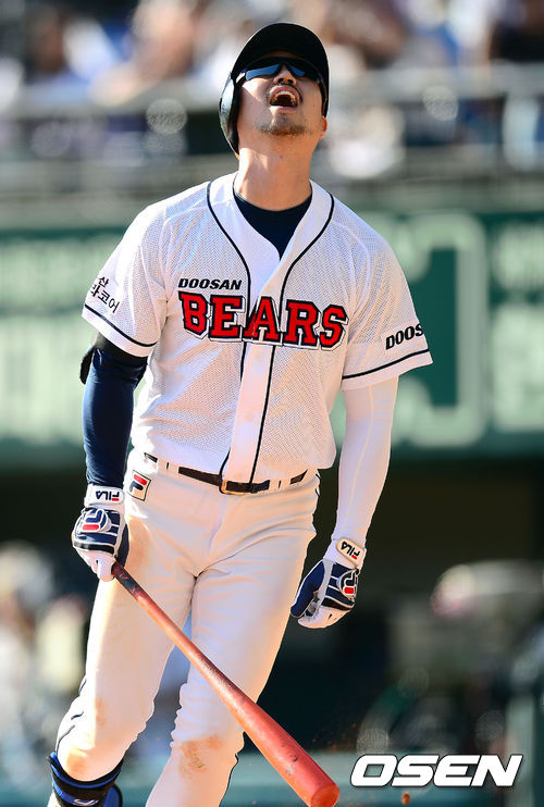 12일 오후 서울 잠실구장에서 열리는 '2013 한국야쿠르트 세븐 프로야구' 준플레이오프 4차전 두산 베어스와 넥센 히어로즈의 경기 3회말 2사 1,2루 두산 오재원이 삼진을 당한 뒤 아쉬워하고 있다.
