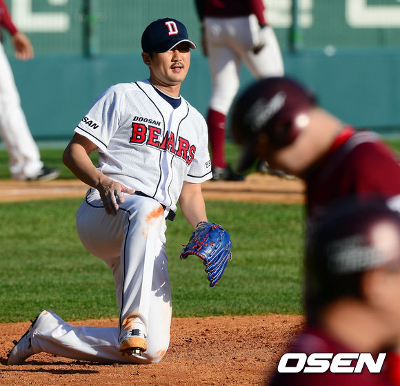 12일 오후 서울 잠실구장에서 열린 '2013 한국야쿠르트 세븐 프로야구' 준플레이오프 4차전 두산 베어스와 넥센 히어로즈의 경기 6회초 1사 2루 박병호를 땅볼로 처리한 이재우가 마운드에 무릎을 꿇고 앉아 있다.