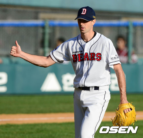 12일 오후 서울 잠실구장에서 열린 '2013 한국야쿠르트 세븐 프로야구' 준플레이오프 4차전 두산 베어스와 넥센 히어로즈의 경기 6회초 2사 1,3루 강정호를 삼진으로 처리한 핸킨스가 최재훈을 향해 엄지 손까락을 들어 보이고 있다.