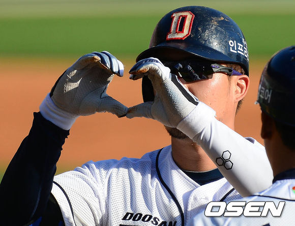 12일 오후 서울 잠실구장에서 열린 '2013 한국야쿠르트 세븐 프로야구' 준플레이오프 4차전 두산 베어스와 넥센 히어로즈의 경기 6회말 1사 오재원이 중전안타를 치고 관중석을 향해 하트 세레모니를 하고 있다.