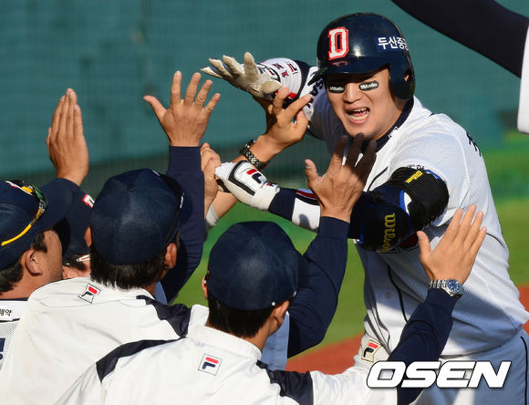 12일 오후 서울 잠실구장에서 열린 '2013 한국야쿠르트 세븐 프로야구' 준플레이오프 4차전 두산 베어스와 넥센 히어로즈의 경기 6회말 1사 1루 최재훈이 투런포를 치고 덕아웃에서 동료들과 하이파이브를 하고 있다.
