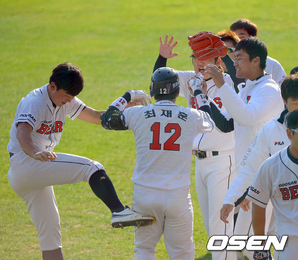 12일 오후 서울 잠실야구장에서 열린 '2013 한국야쿠르트 세븐 프로야구' 준플레이오프 4차전 두산 베어스 와 넥센 히어로즈의 경기, 6회말 1사 1루 최재훈 좌중월 역전 투런 홈런을 날리고 홈인하며 동료들의 환영을 받고 있다.