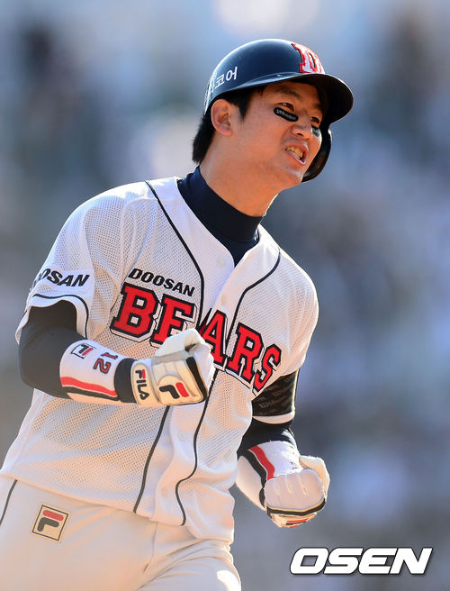 12일 오후 서울 잠실구장에서 열리는 '2013 한국야쿠르트 세븐 프로야구' 준플레이오프 4차전 두산 베어스와 넥센 히어로즈의 경기 6회말 1사 1루 두산 최재훈이 넥센 밴 헤켄을 상대로 투런 홈런을 때린 뒤 기뻐하고 있다.